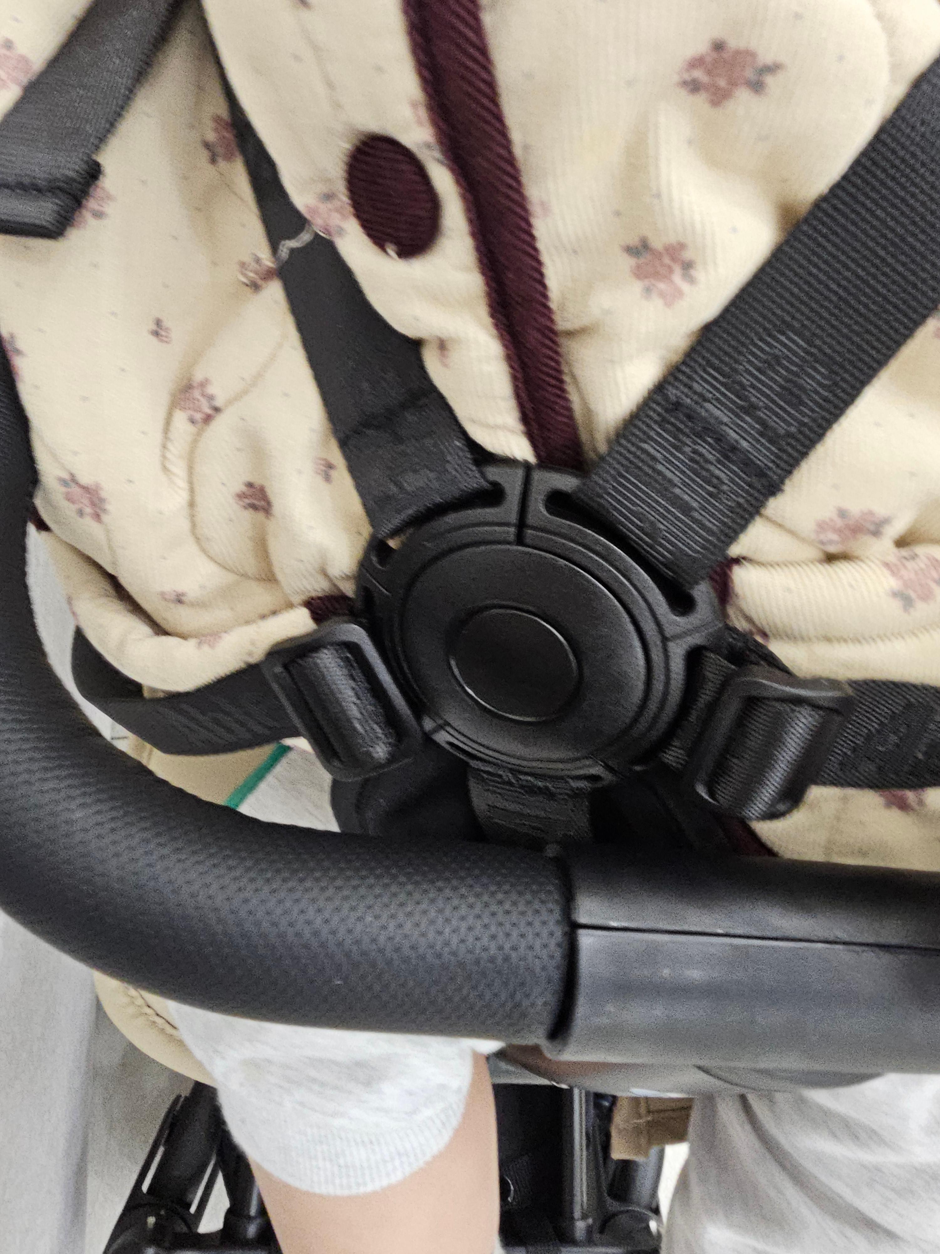 디테일을 살펴보면 더 만족스러워요. 특히 안전벨트! 아이를 태울 때 가장 중요한 게 안전인데, 5점식 안전벨트가 몸을 딱 잡아주고 버클도 튼튼해서 안심입니다. 어깨 패드에도 로고가 예쁘게 들어가 있네요.