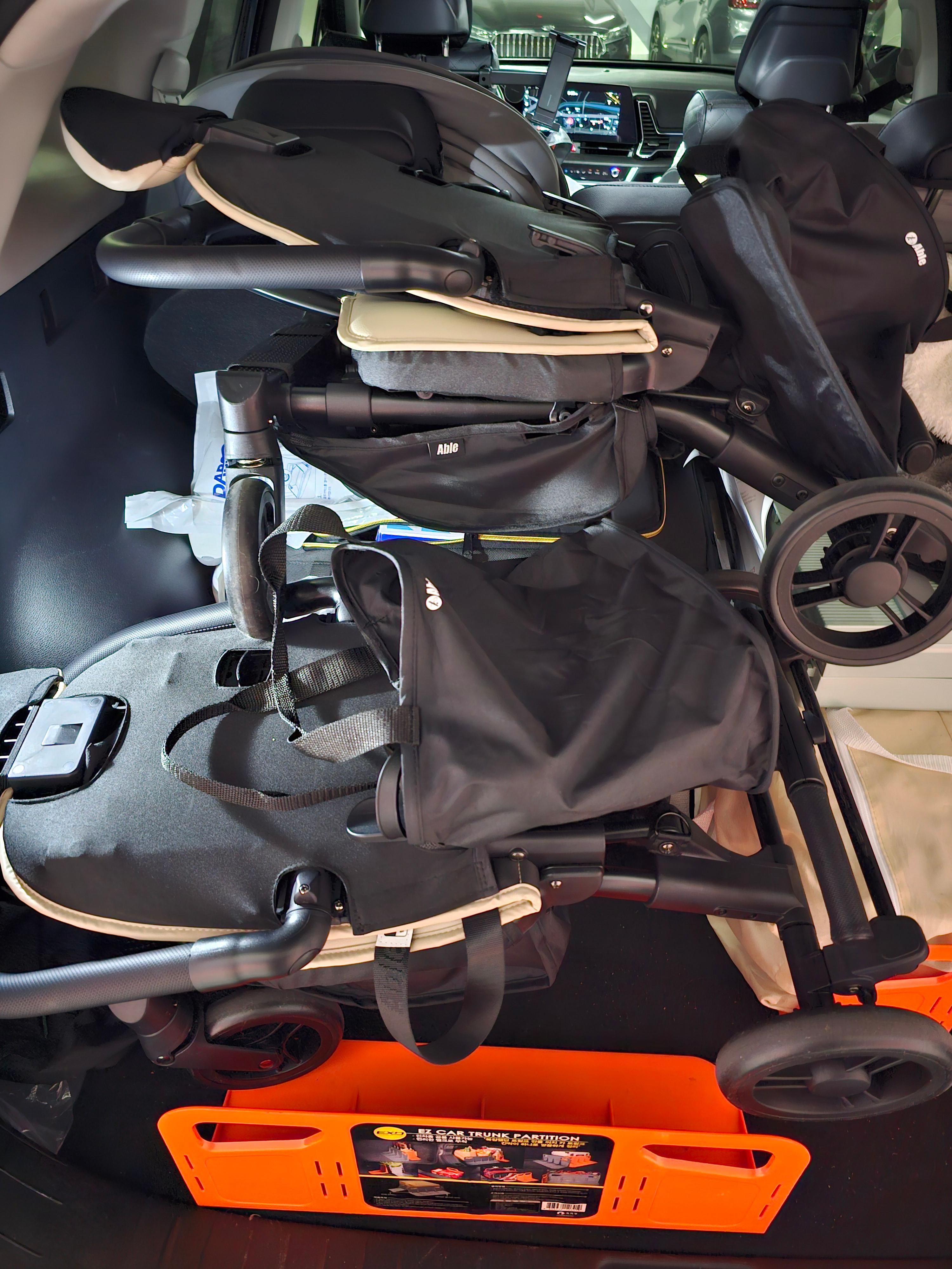 마지막으로 가장 걱정했던 폴딩! 사진 보시면 아시겠지만, SUV 트렁크에 두 대가 넉넉하게 들어갑니다. 폴딩이 간편하고 부피가 작아서 차에 싣고 여행 다니기에도 전혀 부담이 없어요.