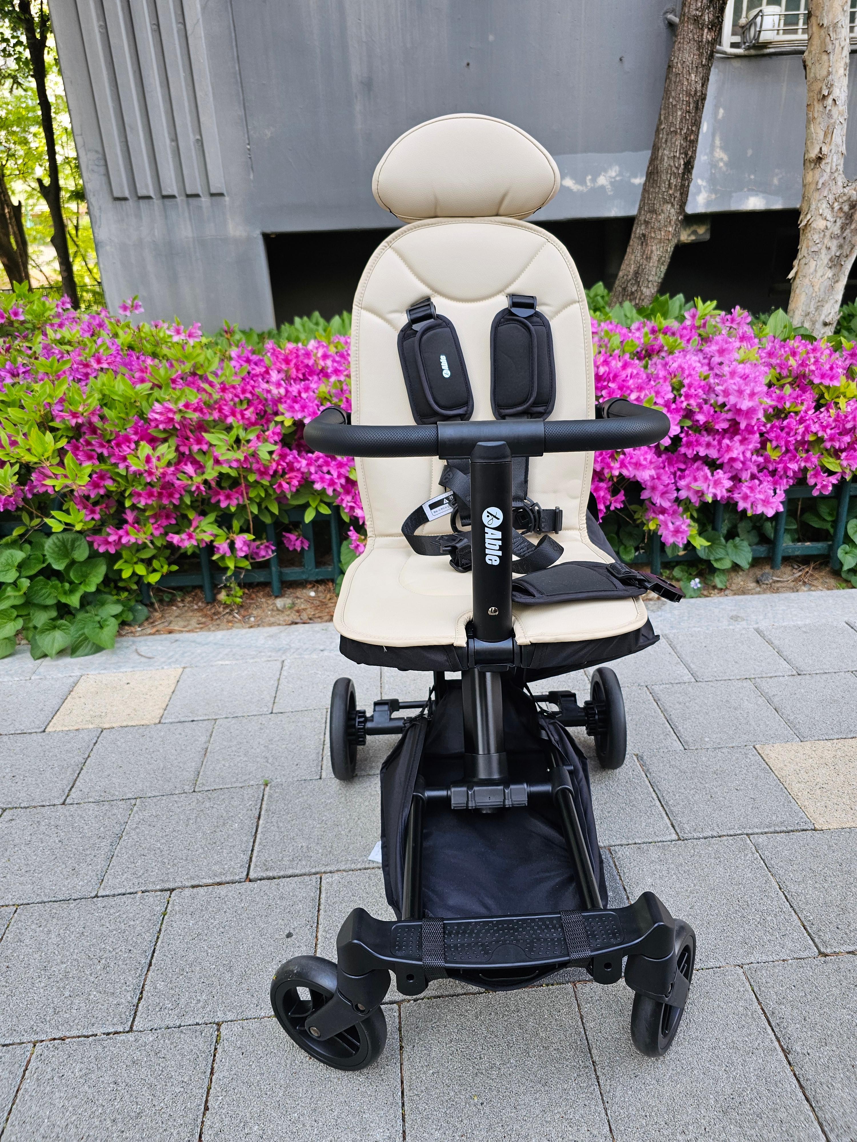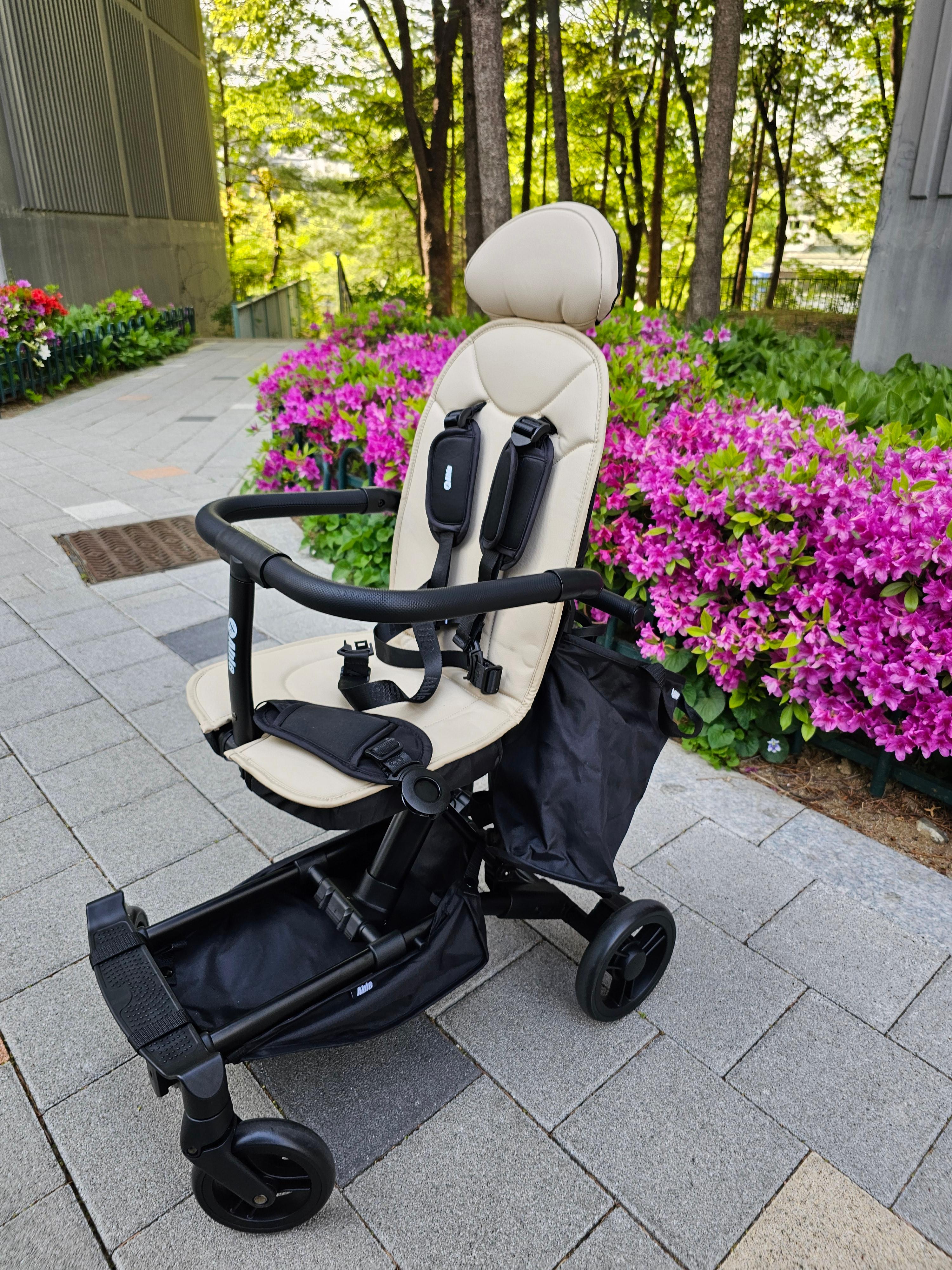 처음 배송받고 야외로 나갔을 때 모습이에요. 화사한 꽃들 옆에 두니 디자인이 더 빛을 발하네요. 시트 높이가 적당해서 아이들이 시야 확보하기에도 아주 좋습니다.