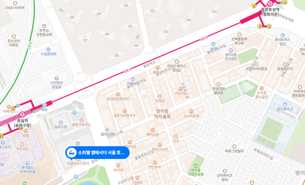 식사는 주로 방이동 먹자골목에 다양한 브랜드 음식들이 있어서 이용하기도 편리합니다.