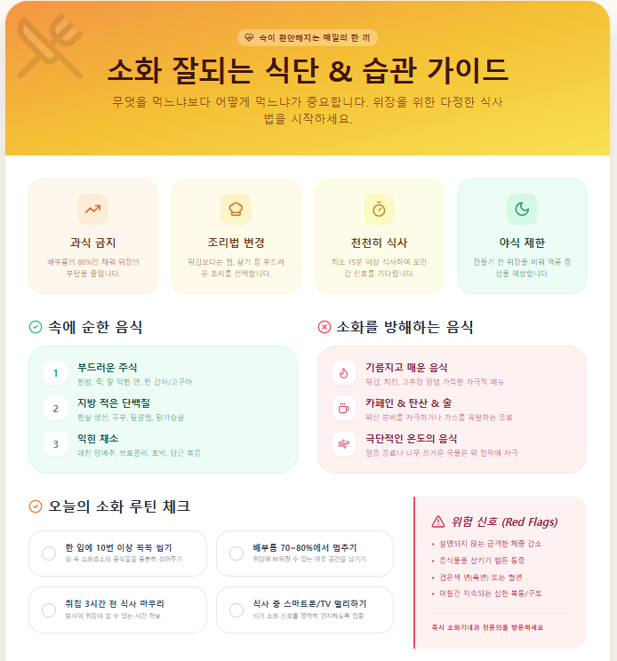 ※ 이 글은 일반적인 정보 제공용이며, 계속되는 복통, 체중 감소, 혈변·흑변, 심한 속쓰림과 같은 증상이 있다면 식단 조절만으로 해결하려 하지 말고, 반드시 소화기내과 진료를 먼저 보시길 권장드립니다.